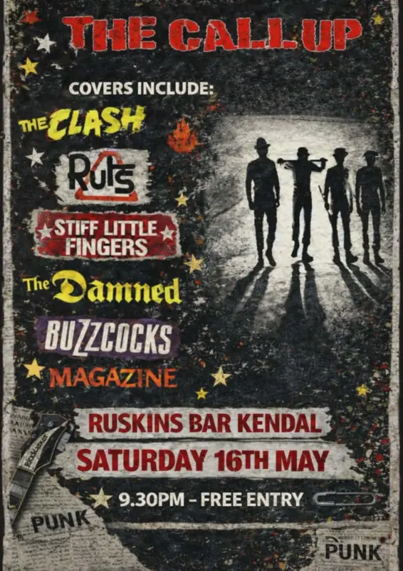 COVERS INCLUDE: THE CLASH, Ruts, STIFF LITTLE FINGERS, The Damned, BUZZCOCKS, MAGAZINE. FREE ENTRY. PUNK.